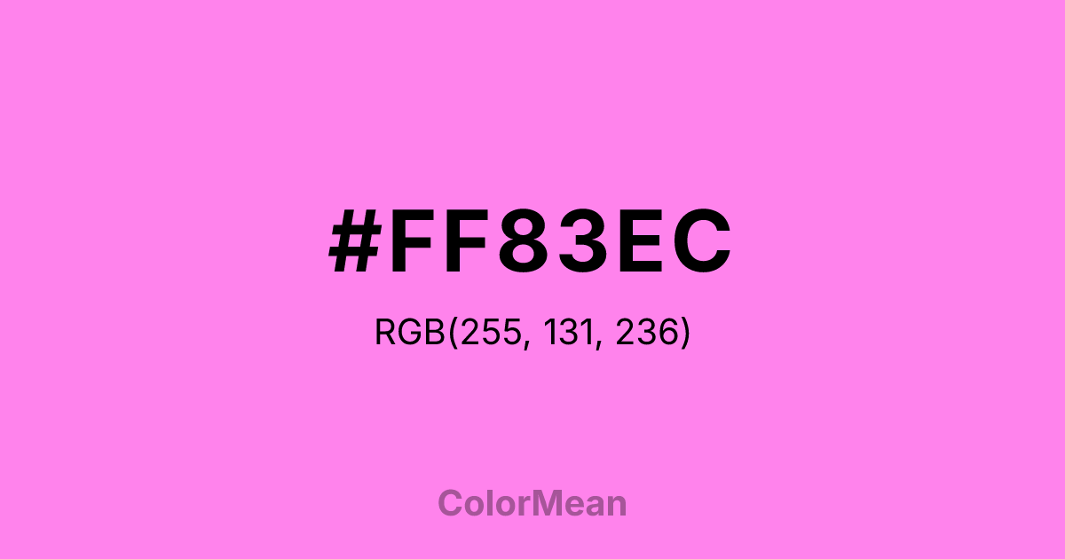 #FF83EC RGB value is (255, 131, 236). The hex color red value is 255, green is 131, and blue is 236. Its HSL format shows a hue of 309°, saturation of 100 percent, and lightness of 76 percent. The CMYK process values are 0 percent, 49 percent, 7 percent, 0 percent.