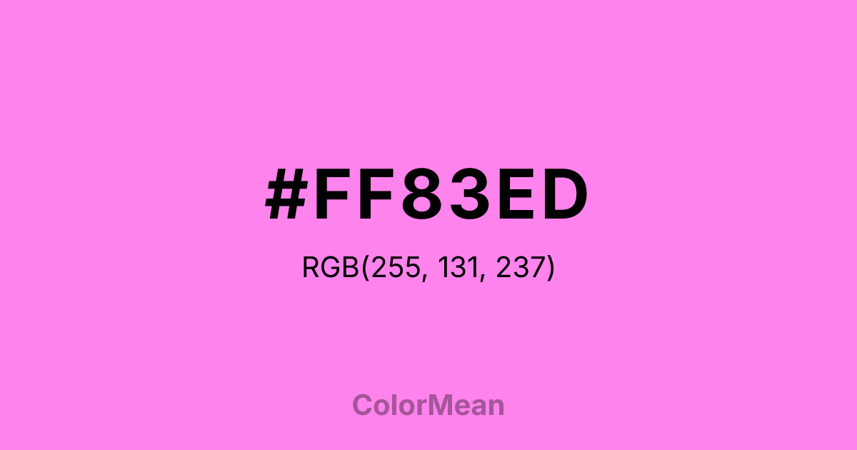 #FF83ED RGB value is (255, 131, 237). The hex color red value is 255, green is 131, and blue is 237. Its HSL format shows a hue of 309°, saturation of 100 percent, and lightness of 76 percent. The CMYK process values are 0 percent, 49 percent, 7 percent, 0 percent.