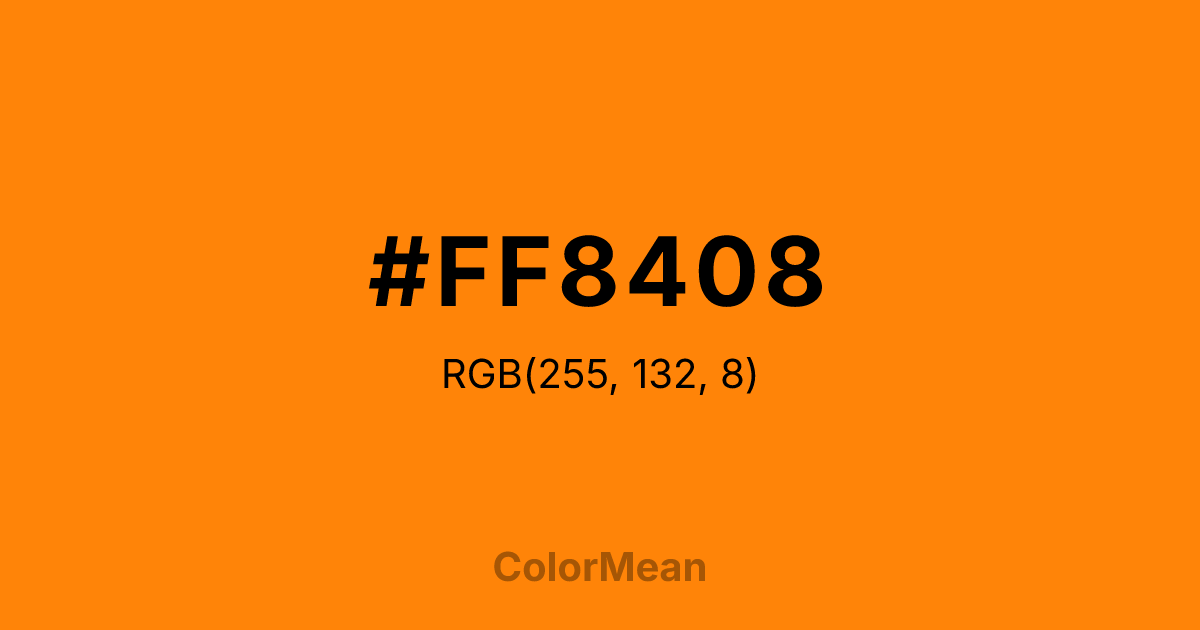 #FF8408 RGB value is (255, 132, 8). The hex color red value is 255, green is 132, and blue is 8. Its HSL format shows a hue of 30°, saturation of 100 percent, and lightness of 52 percent. The CMYK process values are 0 percent, 48 percent, 97 percent, 0 percent.