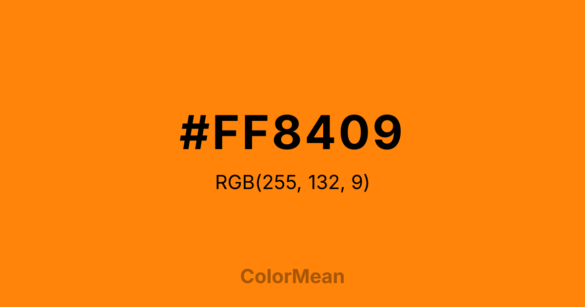 #FF8409 RGB value is (255, 132, 9). The hex color red value is 255, green is 132, and blue is 9. Its HSL format shows a hue of 30°, saturation of 100 percent, and lightness of 52 percent. The CMYK process values are 0 percent, 48 percent, 96 percent, 0 percent.