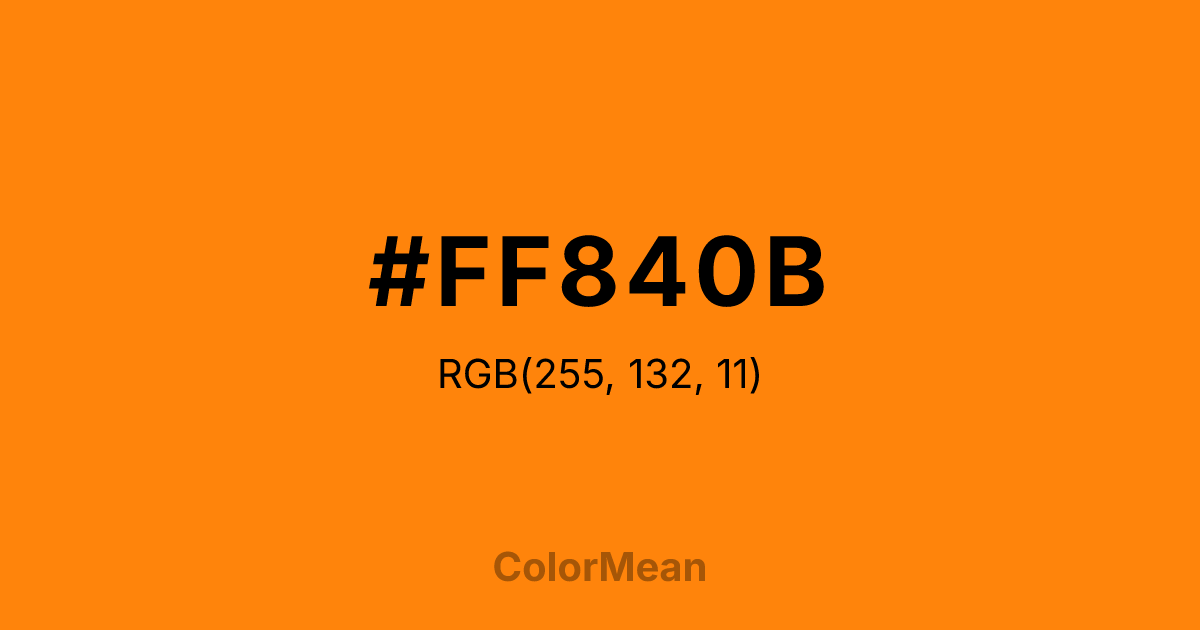#FF840B RGB value is (255, 132, 11). The hex color red value is 255, green is 132, and blue is 11. Its HSL format shows a hue of 30°, saturation of 100 percent, and lightness of 52 percent. The CMYK process values are 0 percent, 48 percent, 96 percent, 0 percent.