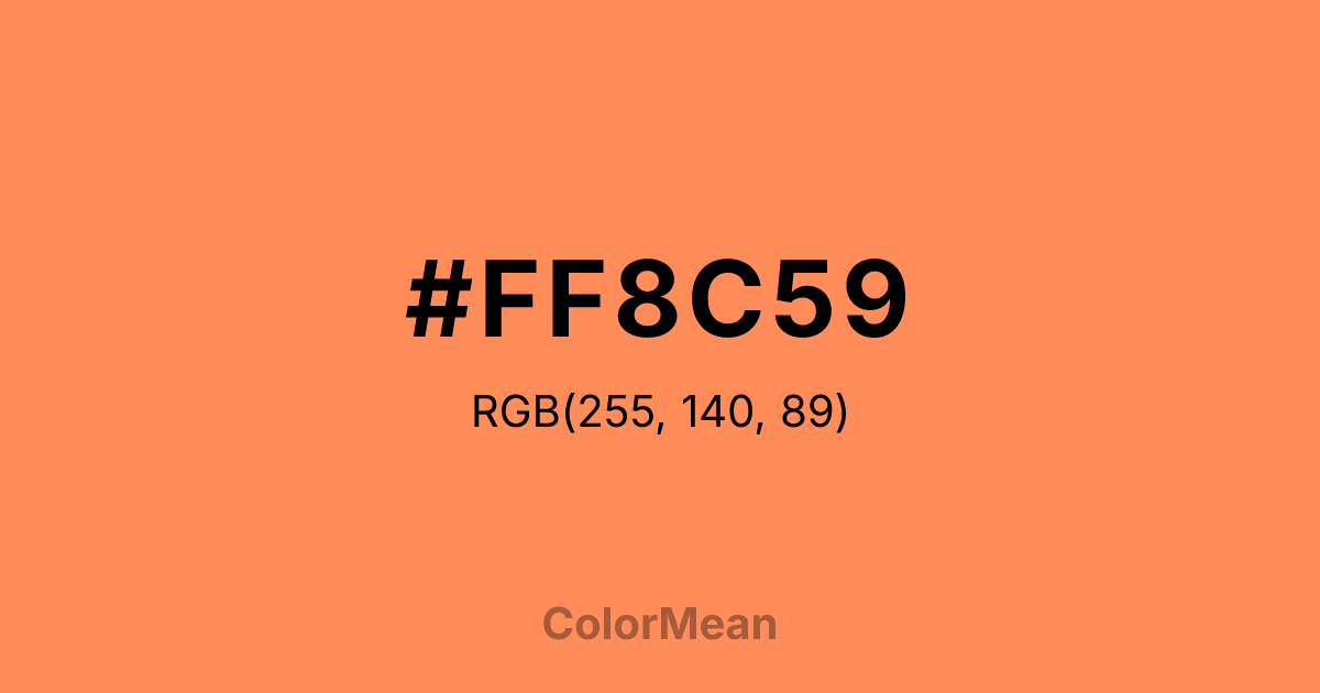 #FF8C59 RGB value is (255, 140, 89). The hex color red value is 255, green is 140, and blue is 89. Its HSL format shows a hue of 18°, saturation of 100 percent, and lightness of 67 percent. The CMYK process values are 0 percent, 45 percent, 65 percent, 0 percent.
