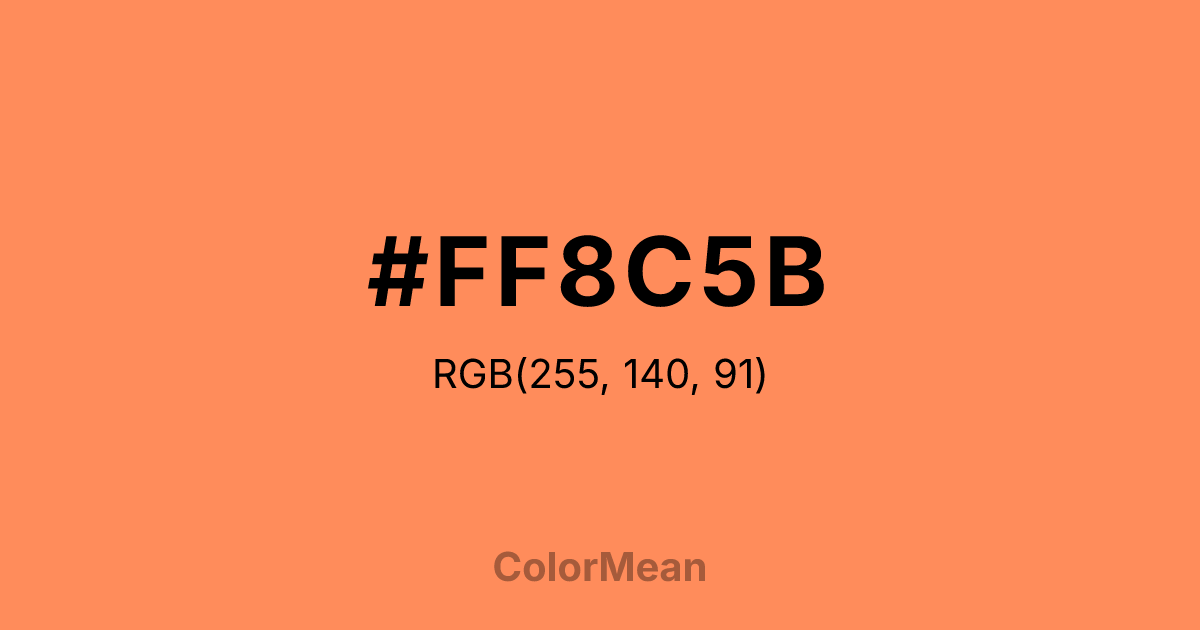 #FF8C5B RGB value is (255, 140, 91). The hex color red value is 255, green is 140, and blue is 91. Its HSL format shows a hue of 18°, saturation of 100 percent, and lightness of 68 percent. The CMYK process values are 0 percent, 45 percent, 64 percent, 0 percent.