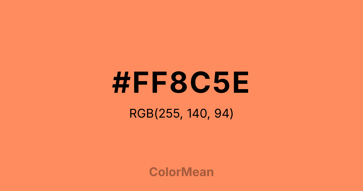 #FF8C5E RGB value is (255, 140, 94). The hex color red value is 255, green is 140, and blue is 94. Its HSL format shows a hue of 17°, saturation of 100 percent, and lightness of 68 percent. The CMYK process values are 0 percent, 45 percent, 63 percent, 0 percent.