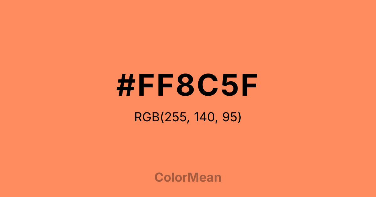 #FF8C5F RGB value is (255, 140, 95). The hex color red value is 255, green is 140, and blue is 95. Its HSL format shows a hue of 17°, saturation of 100 percent, and lightness of 69 percent. The CMYK process values are 0 percent, 45 percent, 63 percent, 0 percent.