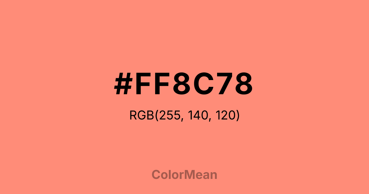 #FF8C78 RGB value is (255, 140, 120). The hex color red value is 255, green is 140, and blue is 120. Its HSL format shows a hue of 9°, saturation of 100 percent, and lightness of 74 percent. The CMYK process values are 0 percent, 45 percent, 53 percent, 0 percent.