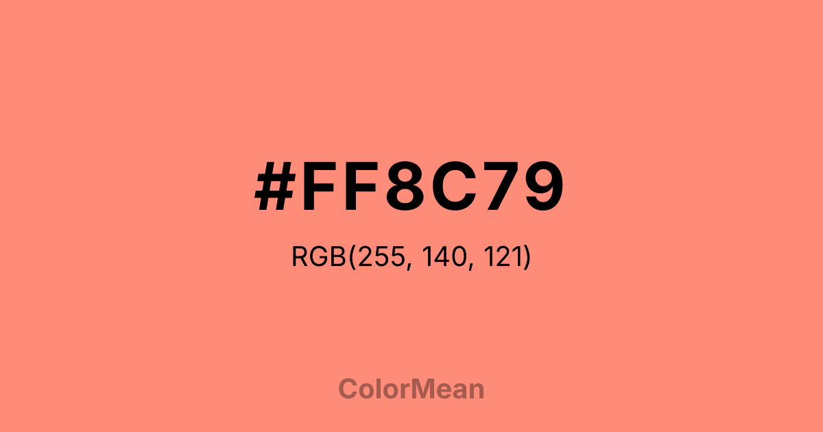 #FF8C79 RGB value is (255, 140, 121). The hex color red value is 255, green is 140, and blue is 121. Its HSL format shows a hue of 9°, saturation of 100 percent, and lightness of 74 percent. The CMYK process values are 0 percent, 45 percent, 53 percent, 0 percent.