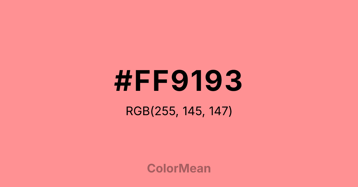 #FF9193 RGB value is (255, 145, 147). The hex color red value is 255, green is 145, and blue is 147. Its HSL format shows a hue of 359°, saturation of 100 percent, and lightness of 78 percent. The CMYK process values are 0 percent, 43 percent, 42 percent, 0 percent.
