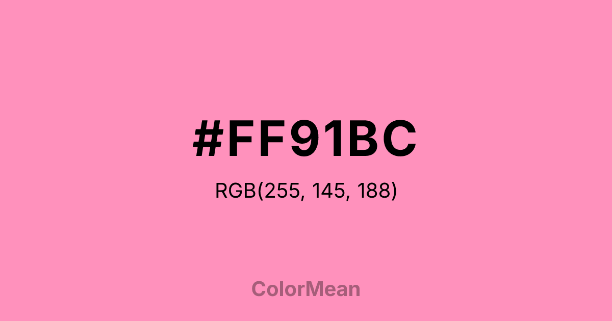 #FF91BC RGB value is (255, 145, 188). The hex color red value is 255, green is 145, and blue is 188. Its HSL format shows a hue of 337°, saturation of 100 percent, and lightness of 78 percent. The CMYK process values are 0 percent, 43 percent, 26 percent, 0 percent.
