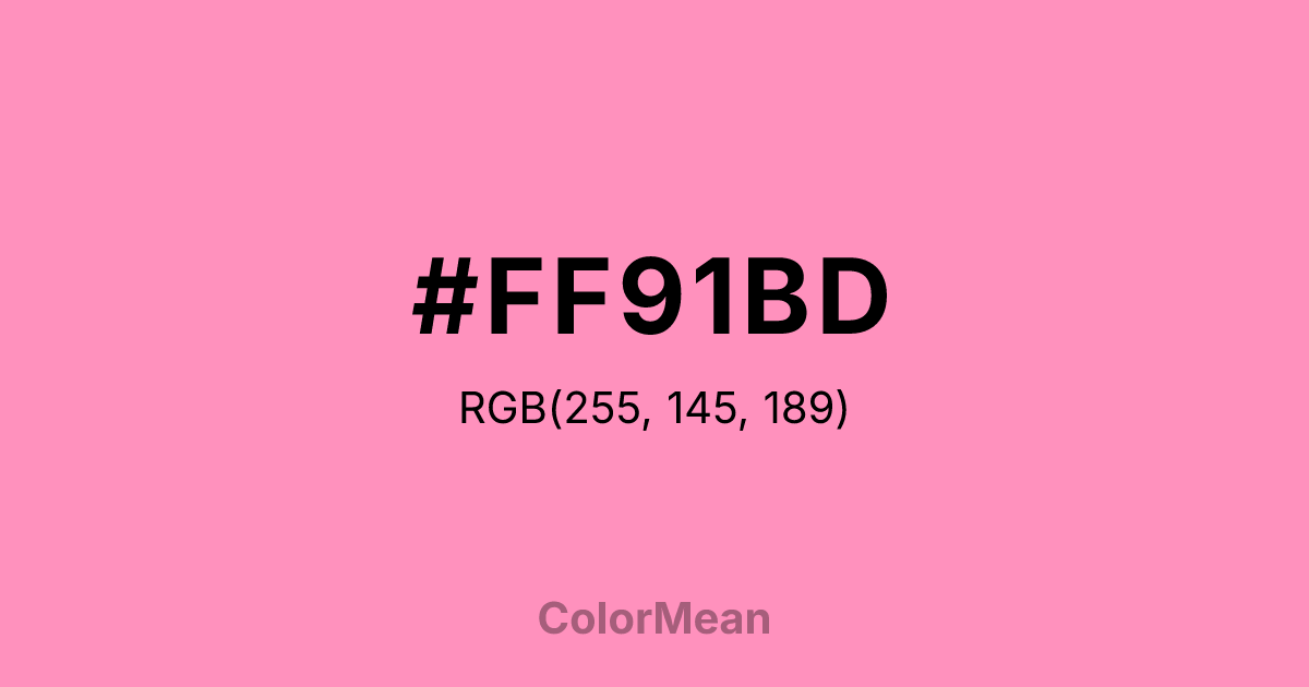 #FF91BD RGB value is (255, 145, 189). The hex color red value is 255, green is 145, and blue is 189. Its HSL format shows a hue of 336°, saturation of 100 percent, and lightness of 78 percent. The CMYK process values are 0 percent, 43 percent, 26 percent, 0 percent.