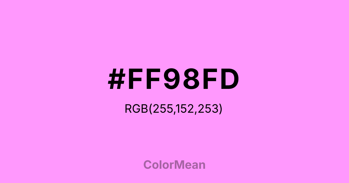 #FF98FD RGB value is (255, 152, 253). The hex color red value is 255, green is 152, and blue is 253. Its HSL format shows a hue of 301°, saturation of 100 percent, and lightness of 80 percent. The CMYK process values are 0 percent, 40 percent, 1 percent, 0 percent.