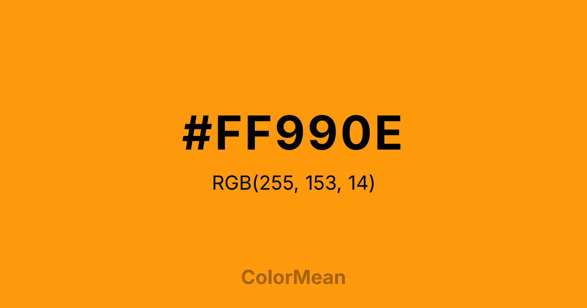 #FF990E RGB value is (255, 153, 14). The hex color red value is 255, green is 153, and blue is 14. Its HSL format shows a hue of 35°, saturation of 100 percent, and lightness of 53 percent. The CMYK process values are 0 percent, 40 percent, 95 percent, 0 percent.