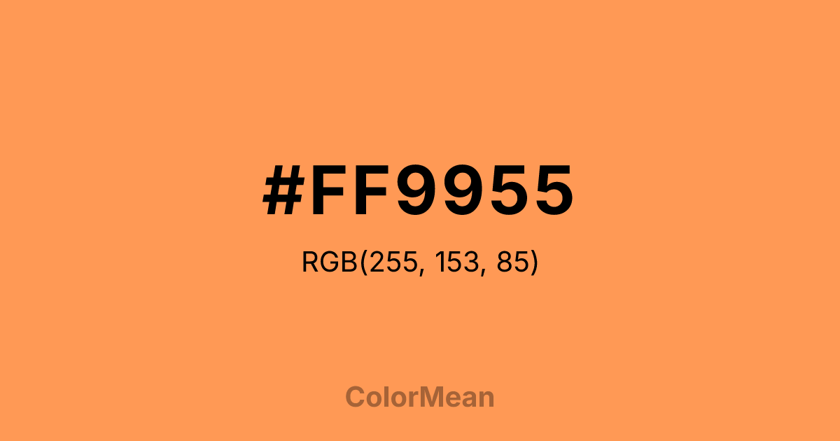#FF9955 RGB value is (255, 153, 85). The hex color red value is 255, green is 153, and blue is 85. Its HSL format shows a hue of 24°, saturation of 100 percent, and lightness of 67 percent. The CMYK process values are 0 percent, 40 percent, 67 percent, 0 percent.