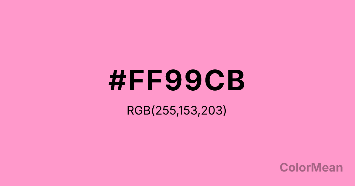 #FF99CB RGB value is (255, 153, 203). The hex color red value is 255, green is 153, and blue is 203. Its HSL format shows a hue of 331°, saturation of 100 percent, and lightness of 80 percent. The CMYK process values are 0 percent, 40 percent, 20 percent, 0 percent.