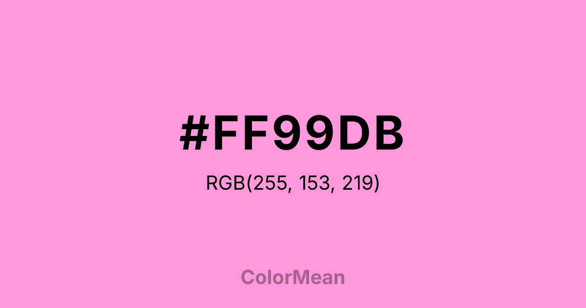 #FF99DB RGB value is (255, 153, 219). The hex color red value is 255, green is 153, and blue is 219. Its HSL format shows a hue of 321°, saturation of 100 percent, and lightness of 80 percent. The CMYK process values are 0 percent, 40 percent, 14 percent, 0 percent.
