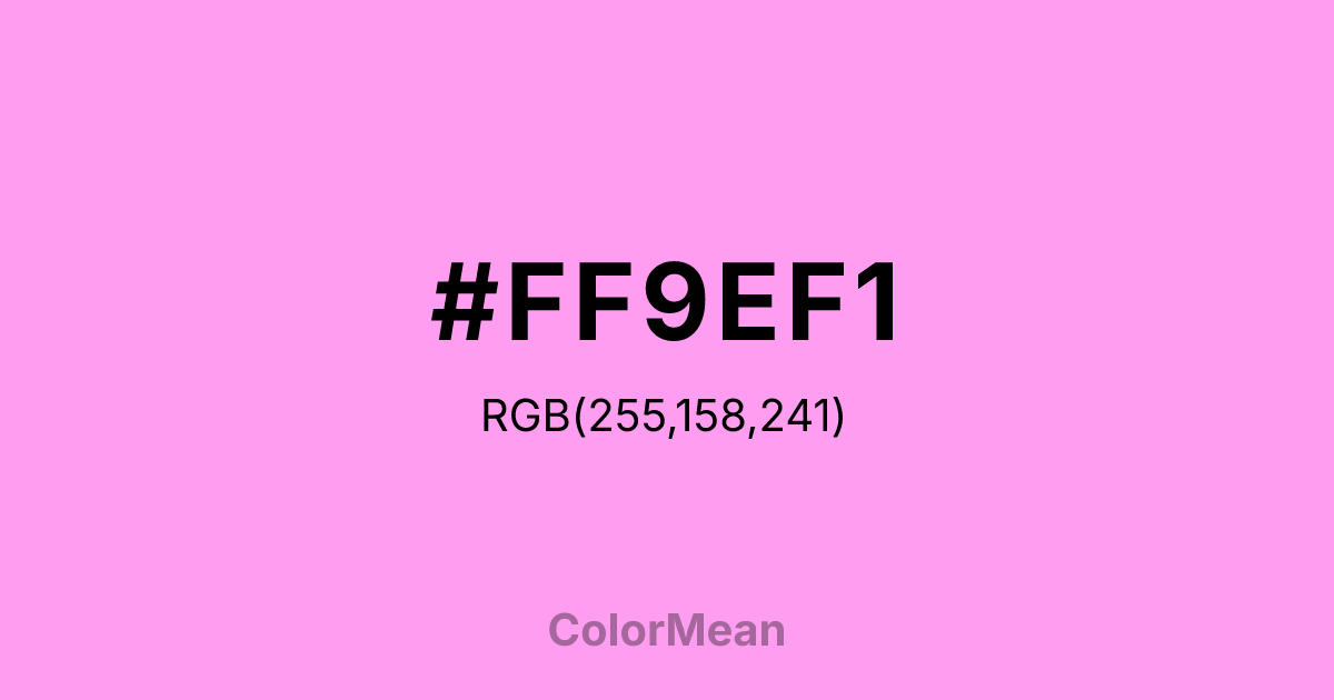#FF9EF1 RGB value is (255, 158, 241). The hex color red value is 255, green is 158, and blue is 241. Its HSL format shows a hue of 309°, saturation of 100 percent, and lightness of 81 percent. The CMYK process values are 0 percent, 38 percent, 5 percent, 0 percent.