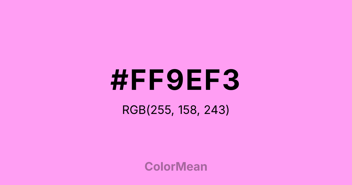 #FF9EF3 RGB value is (255, 158, 243). The hex color red value is 255, green is 158, and blue is 243. Its HSL format shows a hue of 307°, saturation of 100 percent, and lightness of 81 percent. The CMYK process values are 0 percent, 38 percent, 5 percent, 0 percent.
