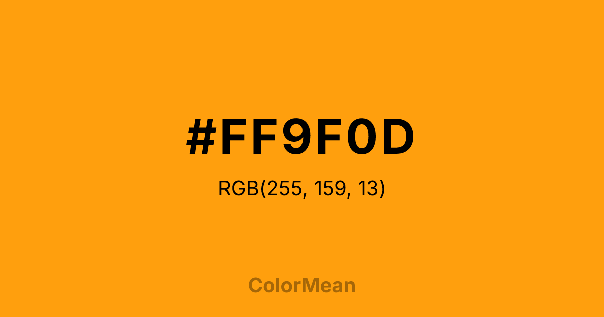 #FF9F0D RGB value is (255, 159, 13). The hex color red value is 255, green is 159, and blue is 13. Its HSL format shows a hue of 36°, saturation of 100 percent, and lightness of 53 percent. The CMYK process values are 0 percent, 38 percent, 95 percent, 0 percent.