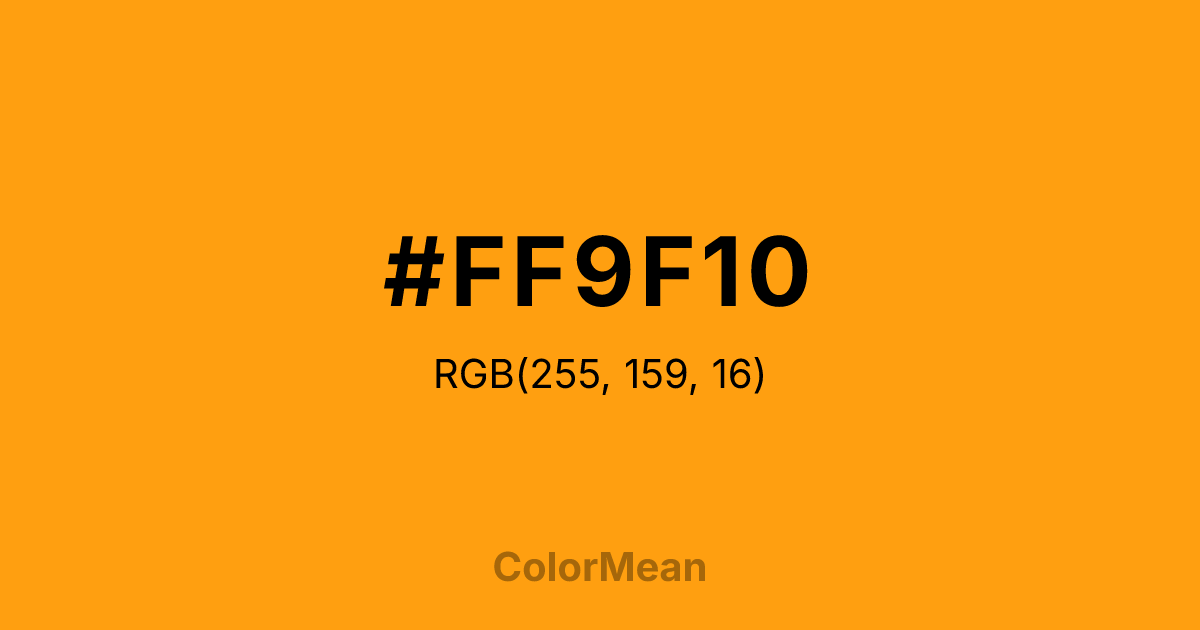 #FF9F10 RGB value is (255, 159, 16). The hex color red value is 255, green is 159, and blue is 16. Its HSL format shows a hue of 36°, saturation of 100 percent, and lightness of 53 percent. The CMYK process values are 0 percent, 38 percent, 94 percent, 0 percent.