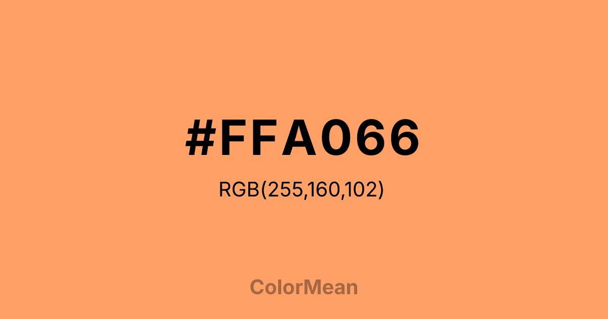 #FFA066 RGB value is (255, 160, 102). The hex color red value is 255, green is 160, and blue is 102. Its HSL format shows a hue of 23°, saturation of 100 percent, and lightness of 70 percent. The CMYK process values are 0 percent, 37 percent, 60 percent, 0 percent.