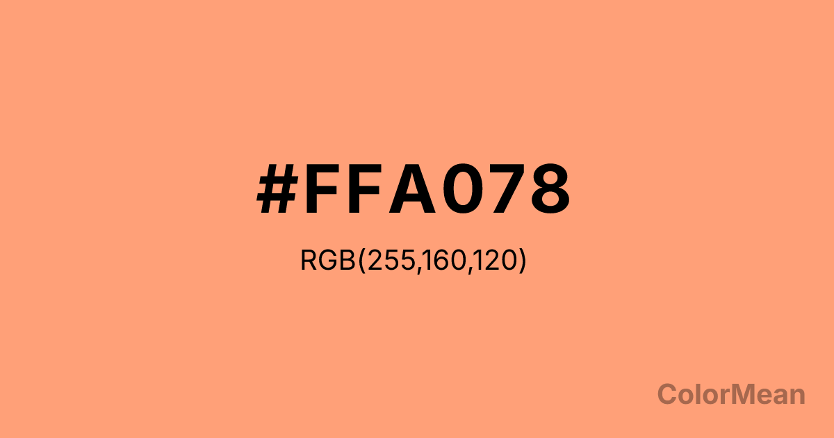 #FFA078 RGB value is (255, 160, 120). The hex color red value is 255, green is 160, and blue is 120. Its HSL format shows a hue of 18°, saturation of 100 percent, and lightness of 74 percent. The CMYK process values are 0 percent, 37 percent, 53 percent, 0 percent.