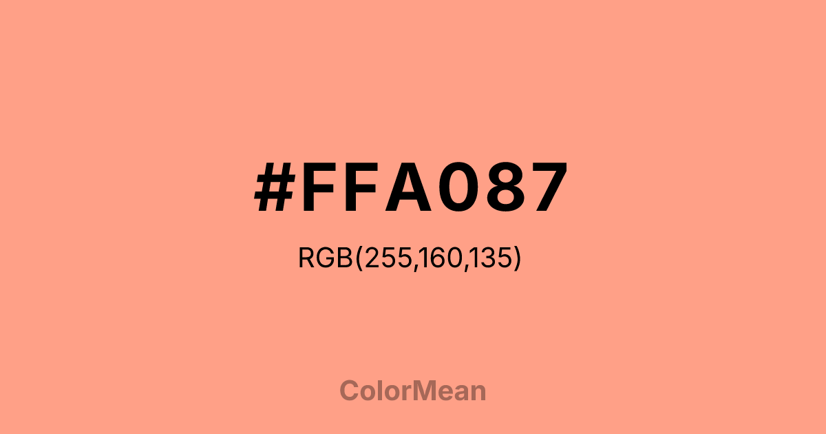 #FFA087 RGB value is (255, 160, 135). The hex color red value is 255, green is 160, and blue is 135. Its HSL format shows a hue of 12°, saturation of 100 percent, and lightness of 76 percent. The CMYK process values are 0 percent, 37 percent, 47 percent, 0 percent.
