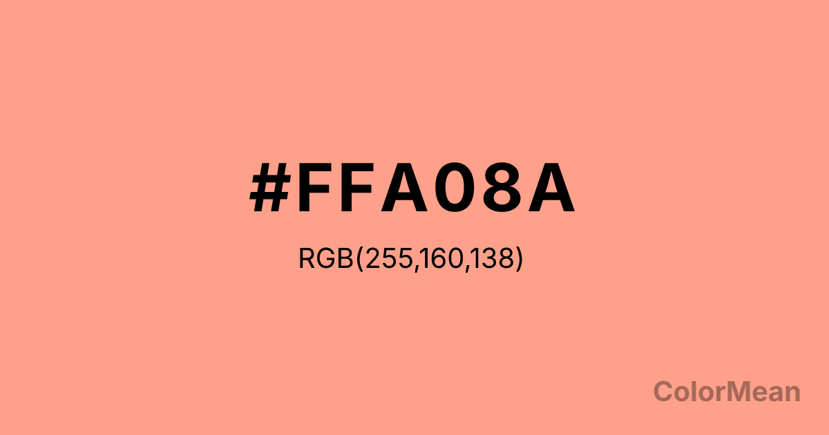 #FFA08A RGB value is (255, 160, 138). The hex color red value is 255, green is 160, and blue is 138. Its HSL format shows a hue of 11°, saturation of 100 percent, and lightness of 77 percent. The CMYK process values are 0 percent, 37 percent, 46 percent, 0 percent.
