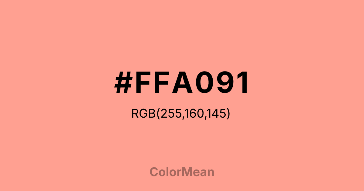 #FFA091 RGB value is (255, 160, 145). The hex color red value is 255, green is 160, and blue is 145. Its HSL format shows a hue of 8°, saturation of 100 percent, and lightness of 78 percent. The CMYK process values are 0 percent, 37 percent, 43 percent, 0 percent.