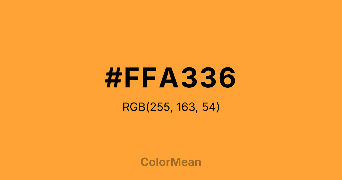 #FFA336 RGB value is (255, 163, 54). The hex color red value is 255, green is 163, and blue is 54. Its HSL format shows a hue of 33°, saturation of 100 percent, and lightness of 61 percent. The CMYK process values are 0 percent, 36 percent, 79 percent, 0 percent.