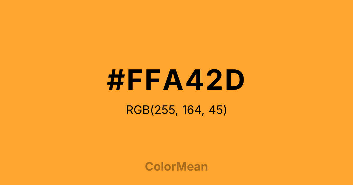 #FFA42D RGB value is (255, 164, 45). The hex color red value is 255, green is 164, and blue is 45. Its HSL format shows a hue of 34°, saturation of 100 percent, and lightness of 59 percent. The CMYK process values are 0 percent, 36 percent, 82 percent, 0 percent.