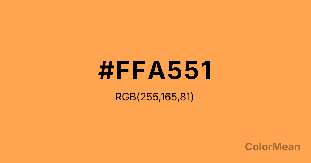 #FFA551 RGB value is (255, 165, 81). The hex color red value is 255, green is 165, and blue is 81. Its HSL format shows a hue of 29°, saturation of 100 percent, and lightness of 66 percent. The CMYK process values are 0 percent, 35 percent, 68 percent, 0 percent.