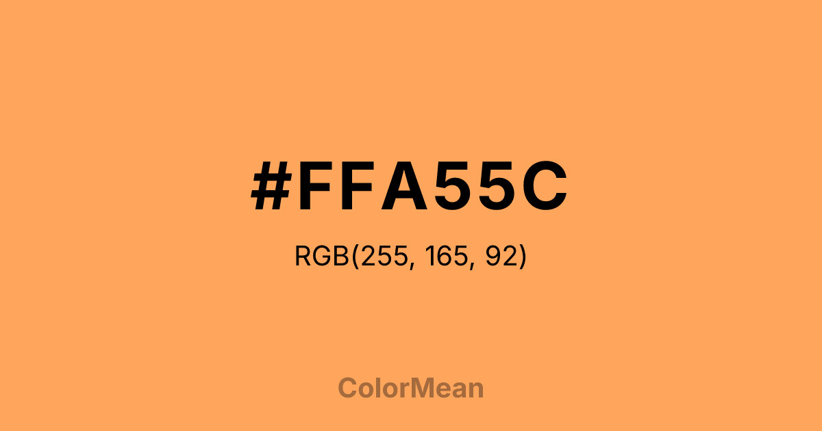 #FFA55C RGB value is (255, 165, 92). The hex color red value is 255, green is 165, and blue is 92. Its HSL format shows a hue of 27°, saturation of 100 percent, and lightness of 68 percent. The CMYK process values are 0 percent, 35 percent, 64 percent, 0 percent.