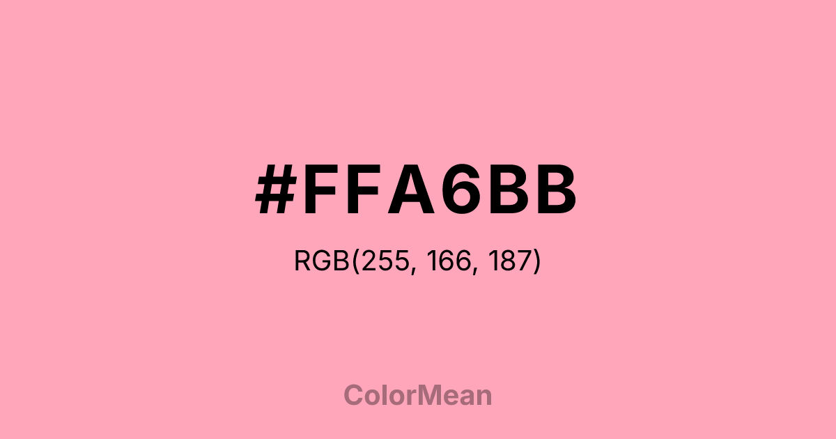 #FFA6BB RGB value is (255, 166, 187). The hex color red value is 255, green is 166, and blue is 187. Its HSL format shows a hue of 346°, saturation of 100 percent, and lightness of 83 percent. The CMYK process values are 0 percent, 35 percent, 27 percent, 0 percent.