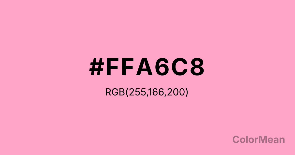 #FFA6C8 RGB value is (255, 166, 200). The hex color red value is 255, green is 166, and blue is 200. Its HSL format shows a hue of 337°, saturation of 100 percent, and lightness of 83 percent. The CMYK process values are 0 percent, 35 percent, 22 percent, 0 percent.