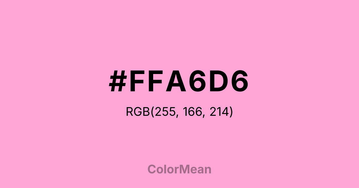 #FFA6D6 RGB value is (255, 166, 214). The hex color red value is 255, green is 166, and blue is 214. Its HSL format shows a hue of 328°, saturation of 100 percent, and lightness of 83 percent. The CMYK process values are 0 percent, 35 percent, 16 percent, 0 percent.