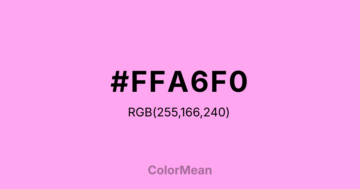 #FFA6F0 RGB value is (255, 166, 240). The hex color red value is 255, green is 166, and blue is 240. Its HSL format shows a hue of 310°, saturation of 100 percent, and lightness of 83 percent. The CMYK process values are 0 percent, 35 percent, 6 percent, 0 percent.