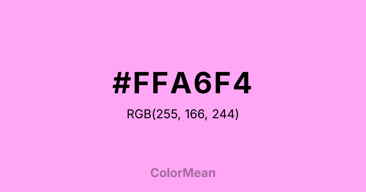 #FFA6F4 RGB value is (255, 166, 244). The hex color red value is 255, green is 166, and blue is 244. Its HSL format shows a hue of 307°, saturation of 100 percent, and lightness of 83 percent. The CMYK process values are 0 percent, 35 percent, 4 percent, 0 percent.