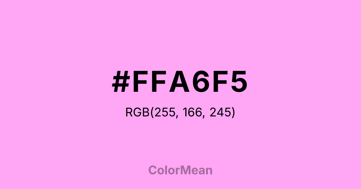 #FFA6F5 RGB value is (255, 166, 245). The hex color red value is 255, green is 166, and blue is 245. Its HSL format shows a hue of 307°, saturation of 100 percent, and lightness of 83 percent. The CMYK process values are 0 percent, 35 percent, 4 percent, 0 percent.