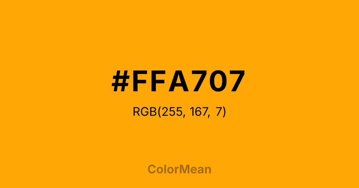 #FFA707 RGB value is (255, 167, 7). The hex color red value is 255, green is 167, and blue is 7. Its HSL format shows a hue of 39°, saturation of 100 percent, and lightness of 51 percent. The CMYK process values are 0 percent, 35 percent, 97 percent, 0 percent.