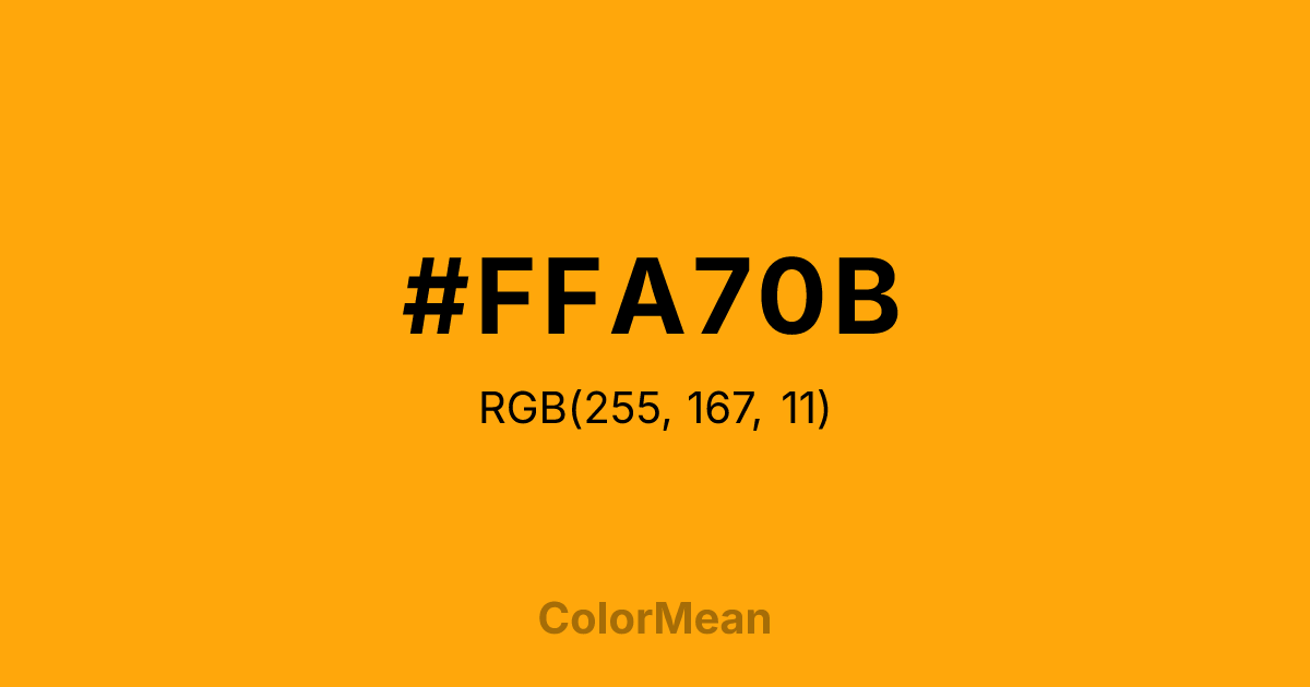 #FFA70B RGB value is (255, 167, 11). The hex color red value is 255, green is 167, and blue is 11. Its HSL format shows a hue of 38°, saturation of 100 percent, and lightness of 52 percent. The CMYK process values are 0 percent, 35 percent, 96 percent, 0 percent.