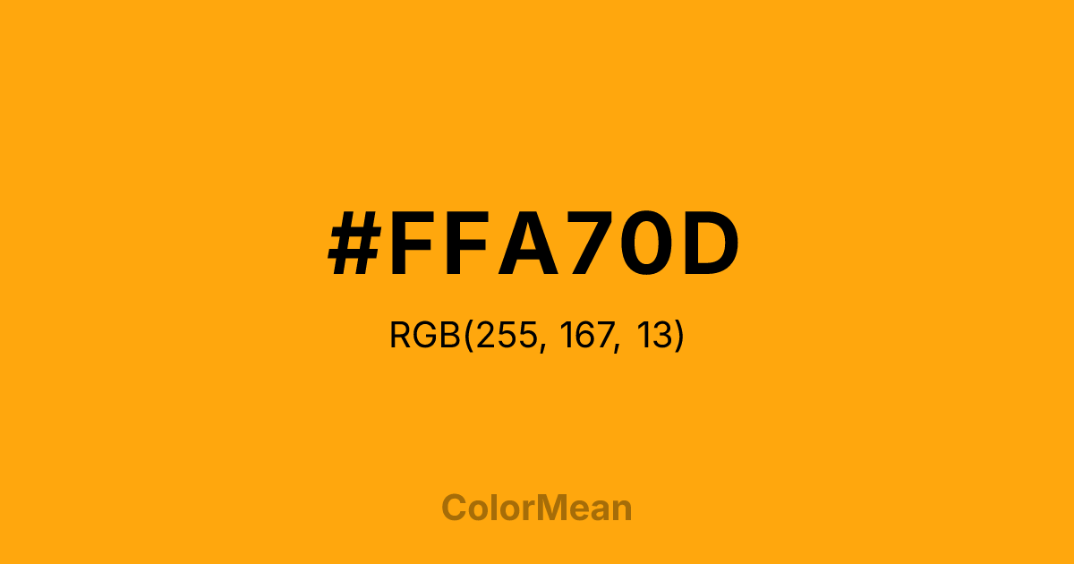 #FFA70D RGB value is (255, 167, 13). The hex color red value is 255, green is 167, and blue is 13. Its HSL format shows a hue of 38°, saturation of 100 percent, and lightness of 53 percent. The CMYK process values are 0 percent, 35 percent, 95 percent, 0 percent.