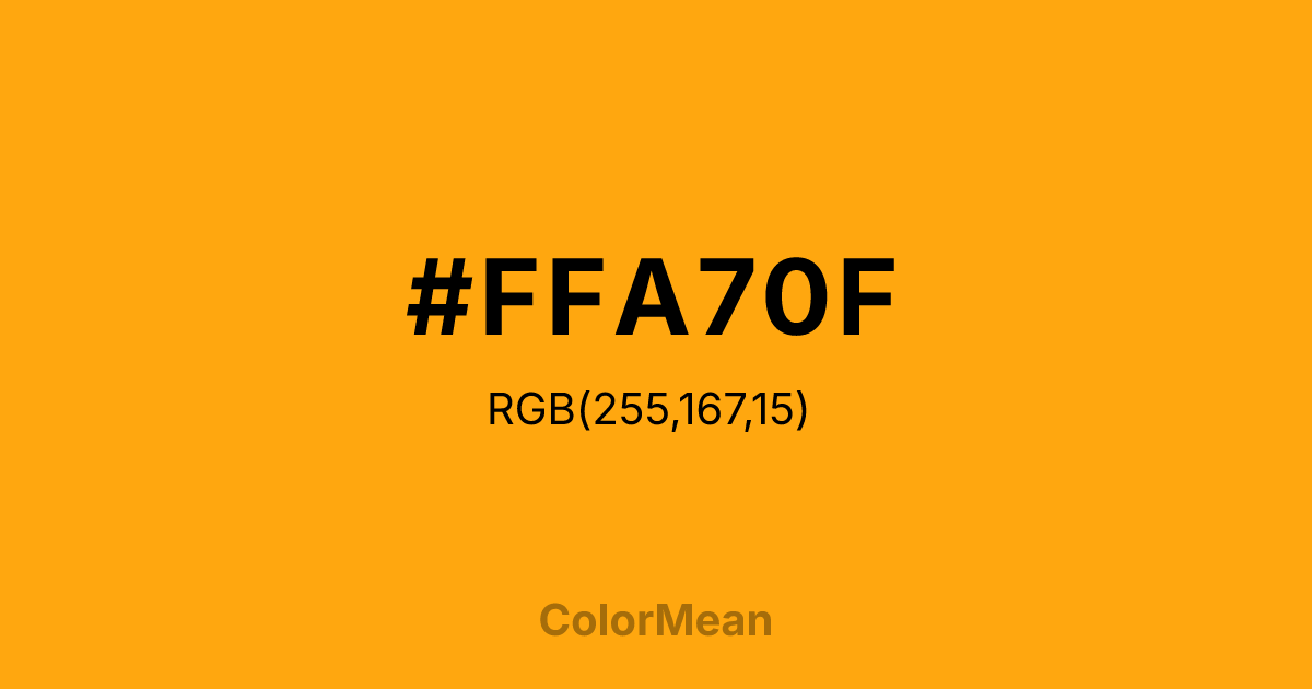 #FFA70F RGB value is (255, 167, 15). The hex color red value is 255, green is 167, and blue is 15. Its HSL format shows a hue of 38°, saturation of 100 percent, and lightness of 53 percent. The CMYK process values are 0 percent, 35 percent, 94 percent, 0 percent.