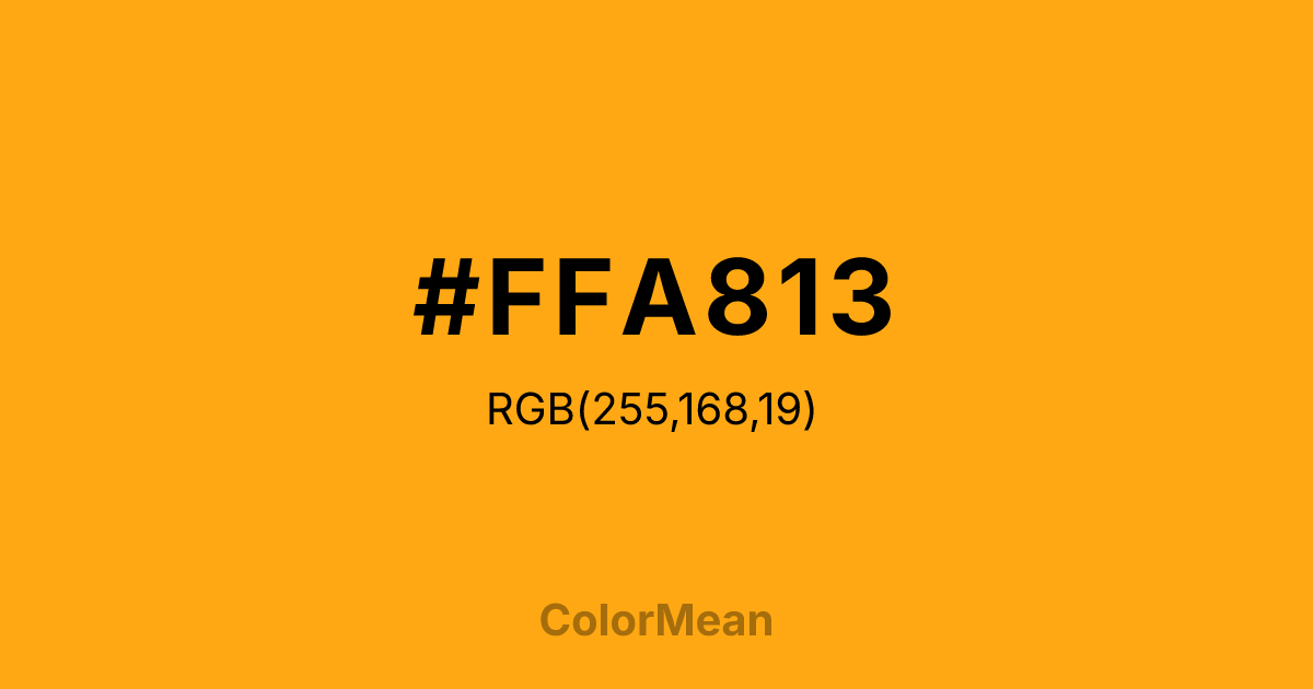 #FFA813 RGB value is (255, 168, 19). The hex color red value is 255, green is 168, and blue is 19. Its HSL format shows a hue of 38°, saturation of 100 percent, and lightness of 54 percent. The CMYK process values are 0 percent, 34 percent, 93 percent, 0 percent.