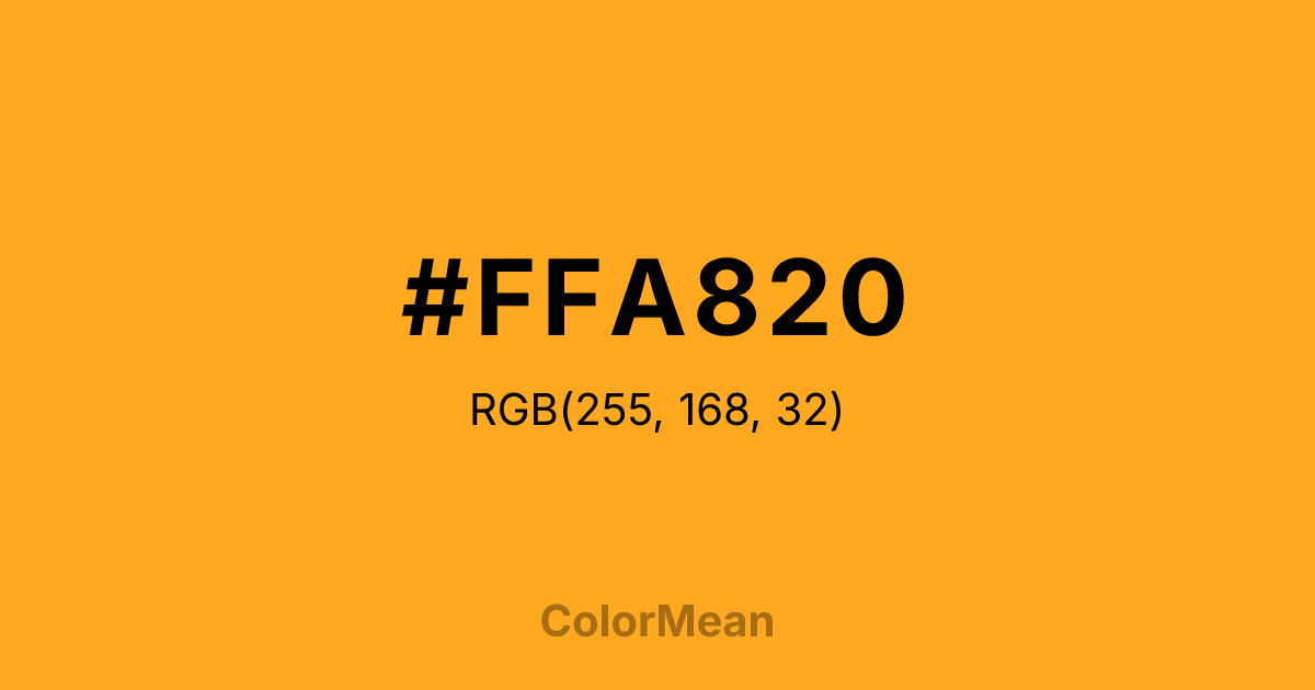 #FFA820 RGB value is (255, 168, 32). The hex color red value is 255, green is 168, and blue is 32. Its HSL format shows a hue of 37°, saturation of 100 percent, and lightness of 56 percent. The CMYK process values are 0 percent, 34 percent, 87 percent, 0 percent.