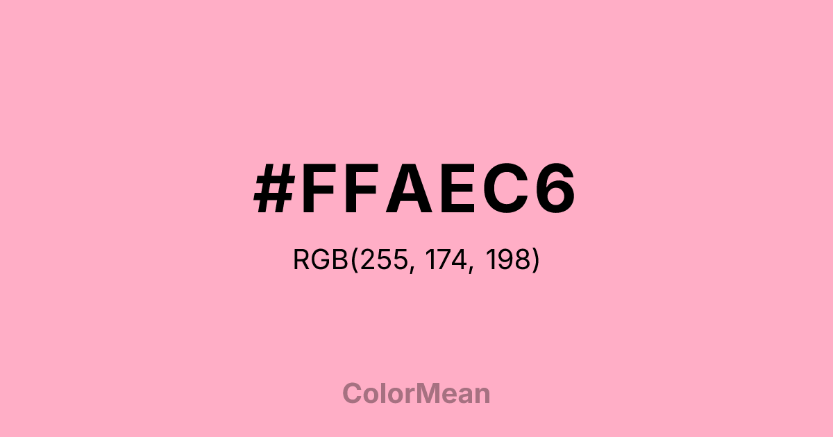 #FFAEC6 RGB value is (255, 174, 198). The hex color red value is 255, green is 174, and blue is 198. Its HSL format shows a hue of 342°, saturation of 100 percent, and lightness of 84 percent. The CMYK process values are 0 percent, 32 percent, 22 percent, 0 percent.