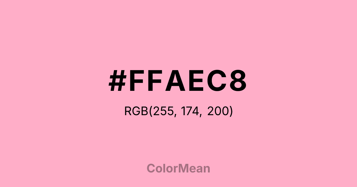 #FFAEC8 RGB value is (255, 174, 200). The hex color red value is 255, green is 174, and blue is 200. Its HSL format shows a hue of 341°, saturation of 100 percent, and lightness of 84 percent. The CMYK process values are 0 percent, 32 percent, 22 percent, 0 percent.
