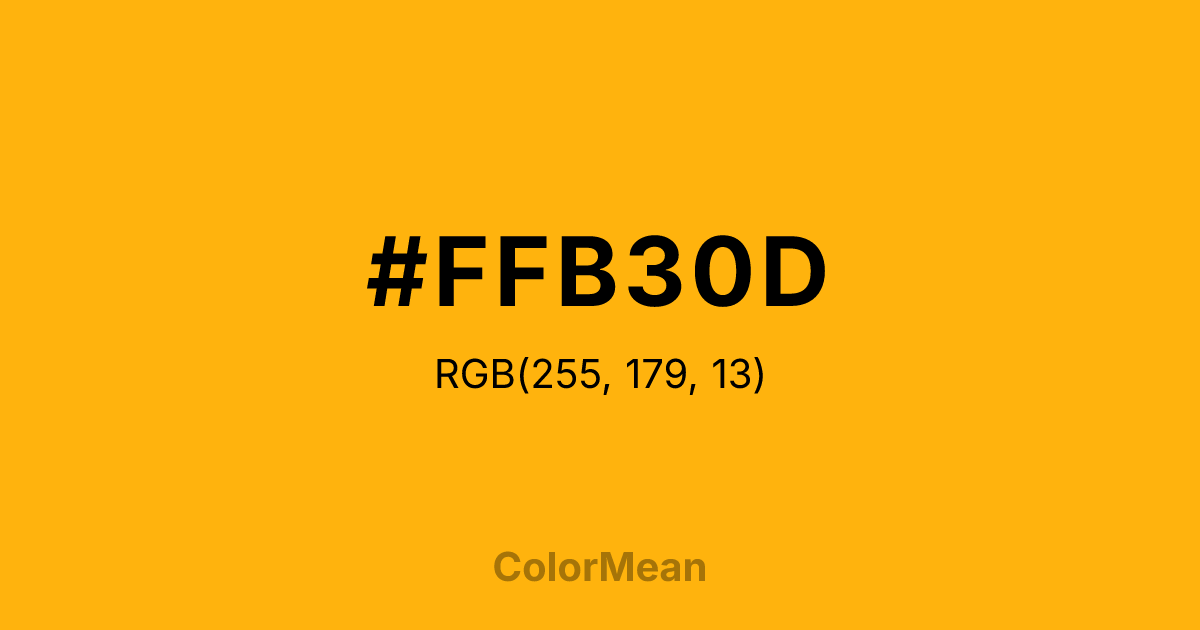 #FFB30D RGB value is (255, 179, 13). The hex color red value is 255, green is 179, and blue is 13. Its HSL format shows a hue of 41°, saturation of 100 percent, and lightness of 53 percent. The CMYK process values are 0 percent, 30 percent, 95 percent, 0 percent.