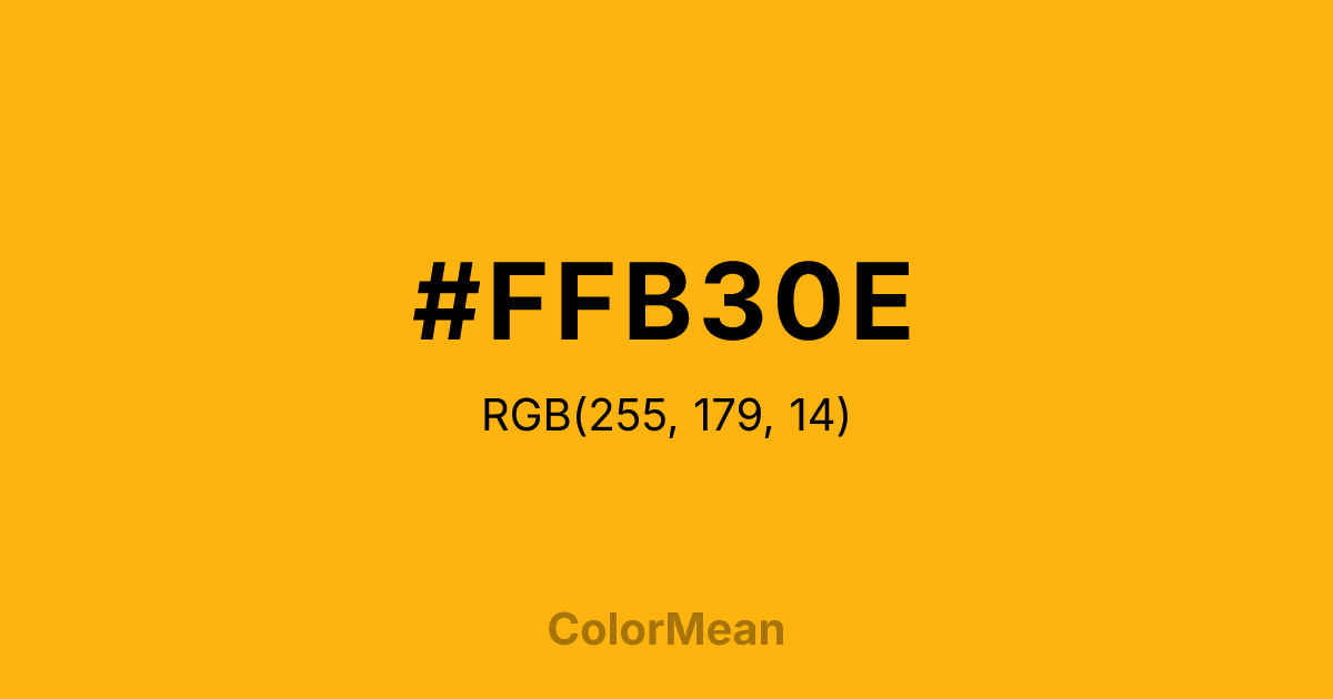 #FFB30E RGB value is (255, 179, 14). The hex color red value is 255, green is 179, and blue is 14. Its HSL format shows a hue of 41°, saturation of 100 percent, and lightness of 53 percent. The CMYK process values are 0 percent, 30 percent, 95 percent, 0 percent.