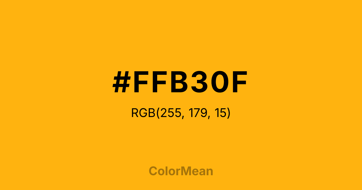 #FFB30F RGB value is (255, 179, 15). The hex color red value is 255, green is 179, and blue is 15. Its HSL format shows a hue of 41°, saturation of 100 percent, and lightness of 53 percent. The CMYK process values are 0 percent, 30 percent, 94 percent, 0 percent.