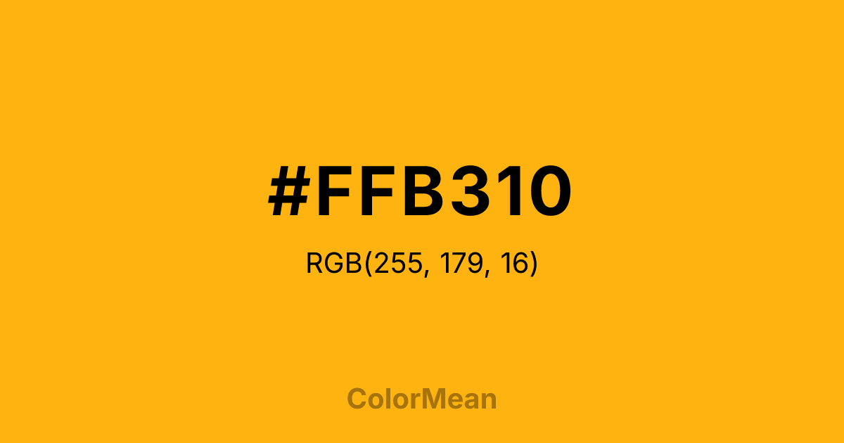 #FFB310 RGB value is (255, 179, 16). The hex color red value is 255, green is 179, and blue is 16. Its HSL format shows a hue of 41°, saturation of 100 percent, and lightness of 53 percent. The CMYK process values are 0 percent, 30 percent, 94 percent, 0 percent.